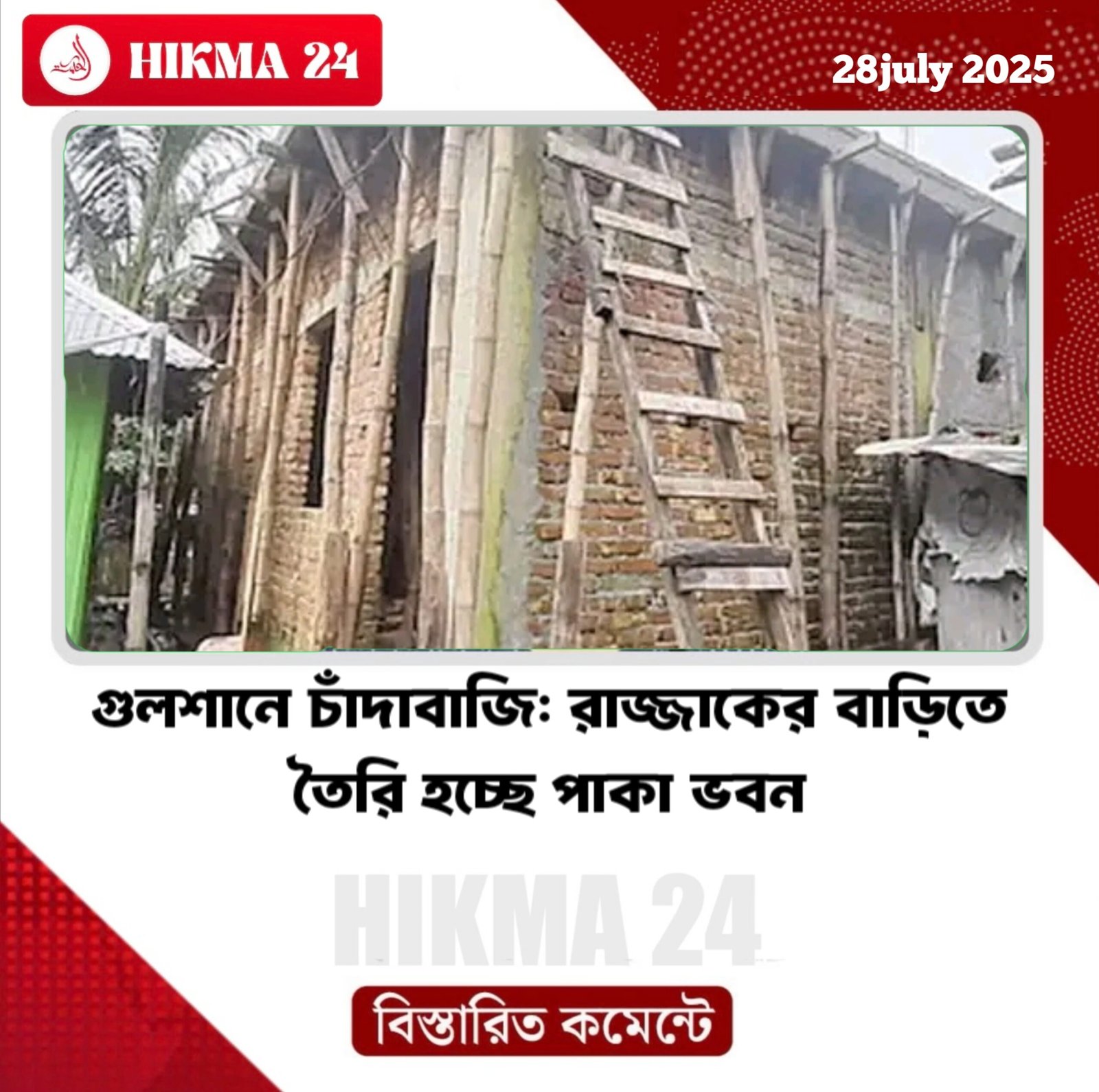 স্থানীয়রা বলেন, আর্থিক অনটনের মধ্যে বেড়ে ওঠা একজন ছাত্রের বাড়িতে হঠাৎ পাকা ভবন নির্মাণ নিয়ে এলাকায় নানা আলোচনা চলছে। এ আলোচনায় নতুন মাত্রা পেয়েছে চাঁদাবাজির অভিযোগে রাজ্জাকের গ্রেপ্তার ঘটনা। যদিও পরিবারের দাবি- জমানো টাকা, অনুদান ও ঋণ নিয়ে ভবনটি করা হচ্ছে।