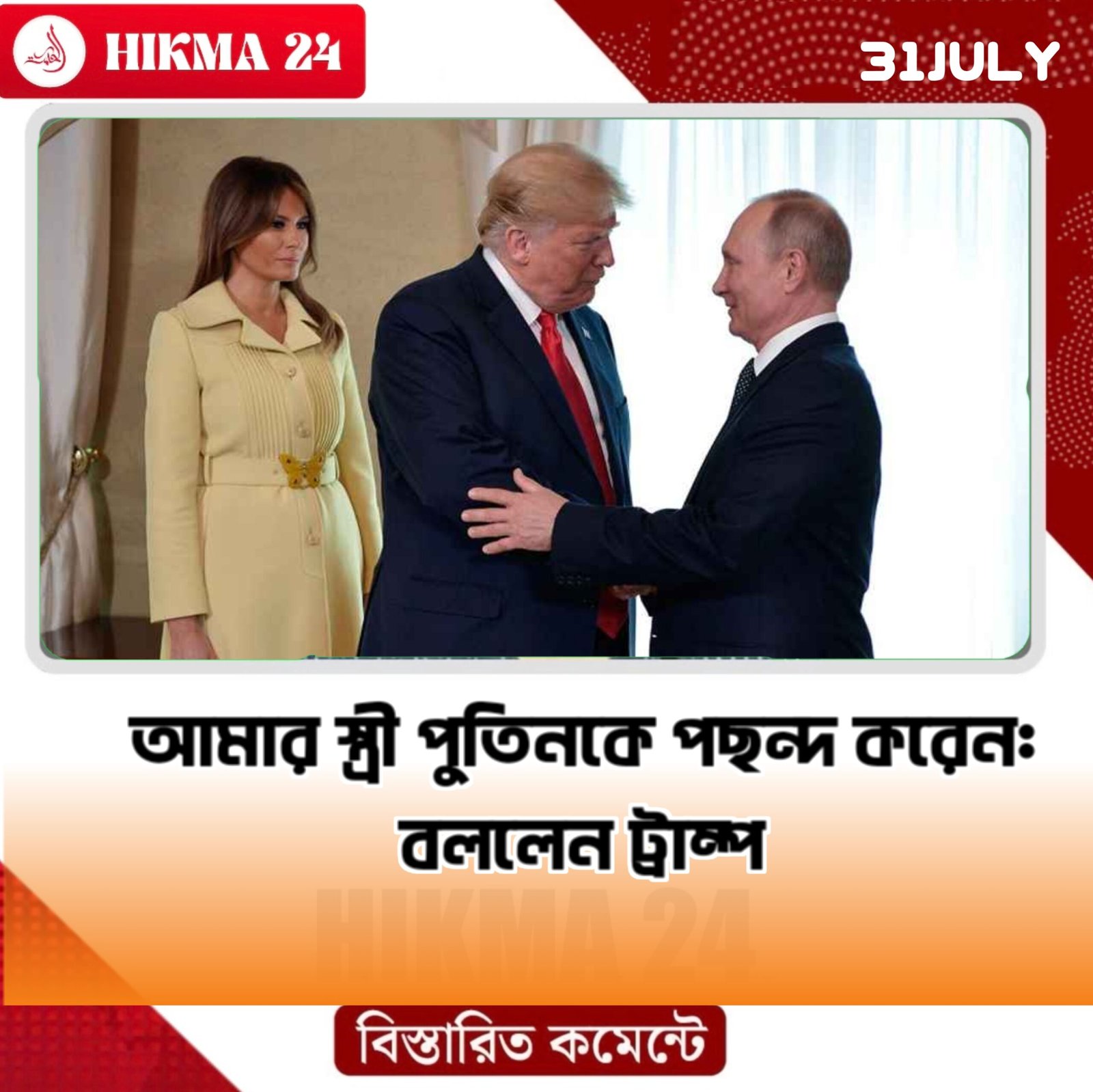 বুধবার (৩০ জুলাই) ওয়াশিংটনে সাংবাদিকদের সঙ্গে মত বিনিময়কালে ট্রাম্প বলেন, মেলানিয়া পুতিনকে পছন্দ করেন। যতবার (পুতিনের সঙ্গে) আমাদের সাক্ষাৎ হয়েছে, পুতিনের সঙ্গে চমৎকারভাবে মানিয়ে নিয়েছেন তিনি।