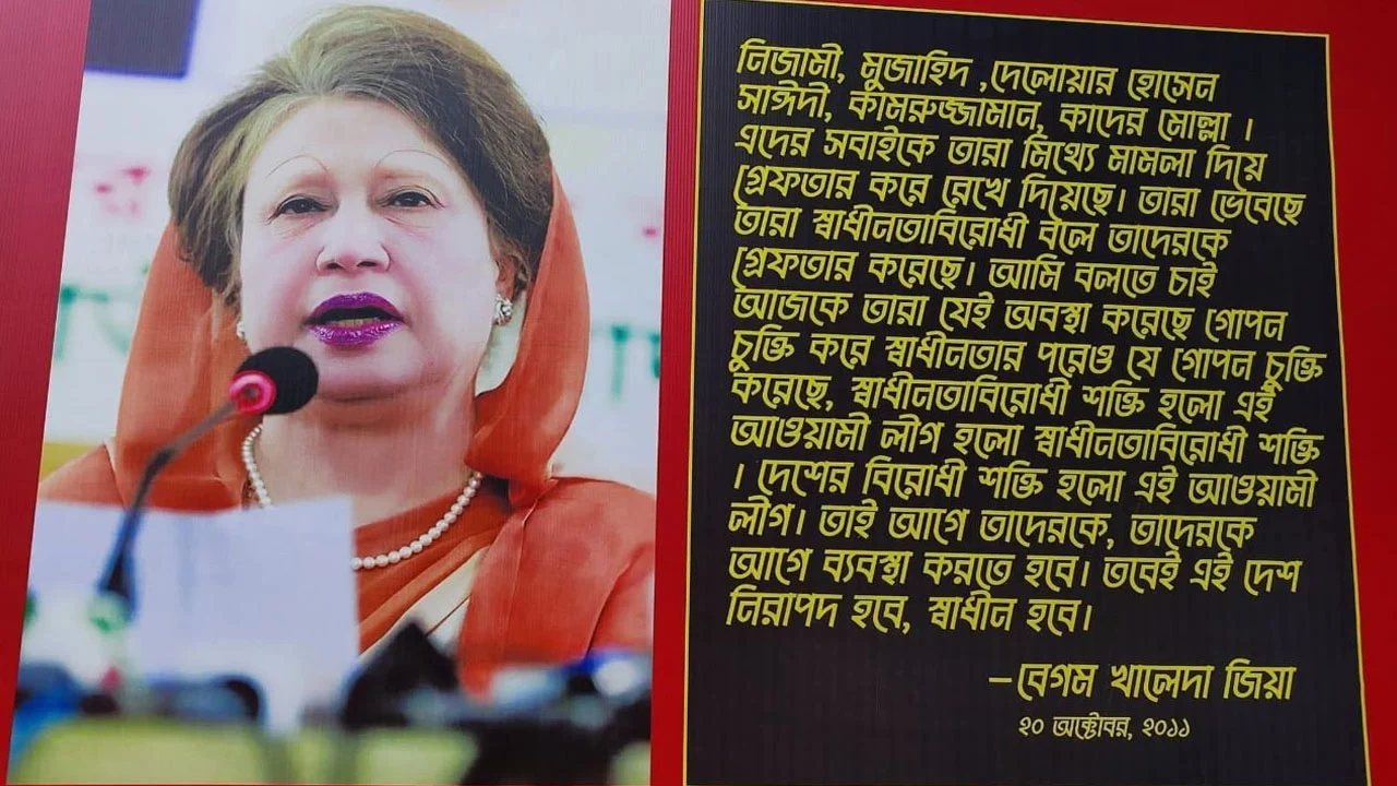 ২০১১ সালের ২০ অক্টোবর তারিখ উল্লেখ করে বেগম খালেদা জিয়ার একটি উদ্ধৃতি সেখানে প্রদর্শিত হয়েছে। যেখানে লিখা আছে- ‘নিজামী, মুজাহিদ, দেলোয়ার হোসেন সাঈদী, কামরুজ্জামান, কাদের মোল্লা। এদের সবাইকে তারা মিথ্যে মামলা দিয়ে গ্রেফতার করে রেখে দিয়েছে। তারা ভেবেছে তারা স্বাধীনতাবিরোধী বলে তাদেরকে গ্রেফতার করেছে। আমি বলতে চাই আজকে তারা যেই অবস্থা করেছে গোপন চুক্তি করে স্বাধীনতার পরেও যে গোপন চুক্তি করেছে, স্বাধীনতাবিরোধী শক্তি হলো এই আওয়ামী লীগ হলো স্বাধীনতাবিরোধী শক্তি । দেশের বিরোধী শক্তি হলো এই আওয়ামী লীগ। তাই আগে তাদেরকে, তাদেরকে আগে ব্যবস্থা করতে হবে। তবেই এই দেশ নিরাপদ হবে, স্বাধীন হবে।’